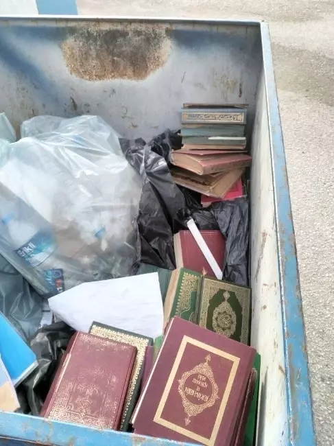 Bursa'da Kur'an-ı Kerimlerin çöpe atılması vatandaşları sinirlendirdi. Belediyelerin geri dönüşüm toplama merkezlerinde Kur'an-ı Kerimlerin içki şişeleri ve çöplerin arasına atıldığını fotoğraflarla belgeleyen Kamu-Sen Bursa İl Temsilcisi Selçuk Türkoğlu ile Türk Diyanet Vakıf-Sen Şube Başkanı Ayhan Polat, bu duruma tepki gösterdi.