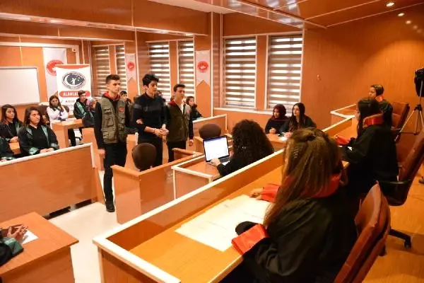 Öğrencilerin teoride öğrendiklerini pratiğe dökmek için okul yönetimi tarafından gerçek mahkeme salonunu aratmayacak şekilde donatılan sınıfta öğrenciler, senaryo gereği eşini bıçaklayan ve cezaevinde bulunan sanığın duruşmasını gerçekleştirdi.