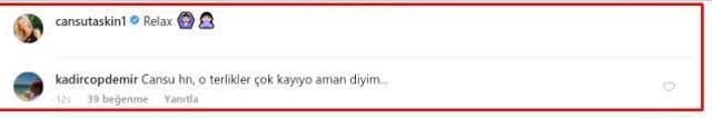 Cansu Taşkın ateşli pozunu paylaşıp altına "Relax" notunu düştü. Oyuncu Kadir Çöpdemir fotoğrafın altına "O terlikler çok kayıyor aman dikkat." diye uyardı