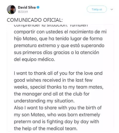 Manchester City'de forma giyen İspanyol yıldız David Silva, oğlunun erken doğduğunu ve hayatta kalmak için mücadele verdiğini duyurdu.