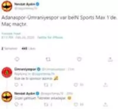 Nevzat Aydın maçtan önce sosyal medyadan, "Adanaspor-Ümraniyespor var beIN Sports Max 1'de. Maç maçtır." tweet'ini atmıştı.
